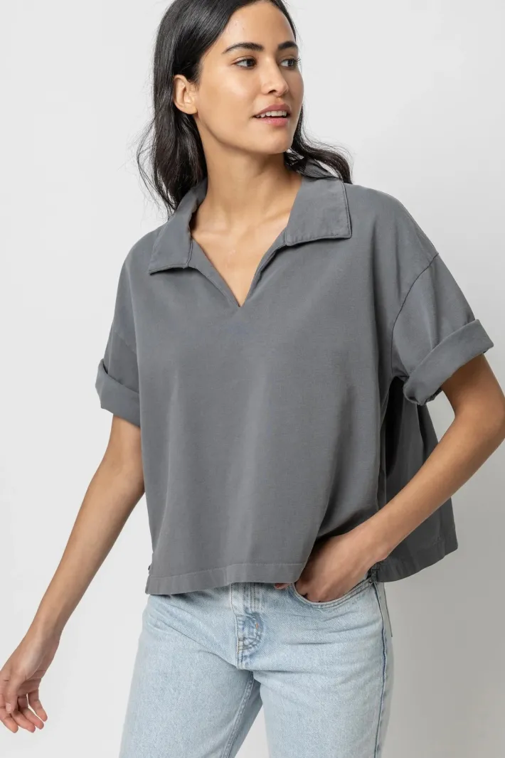 Lilla P Mixed Media Collared Top in Granite